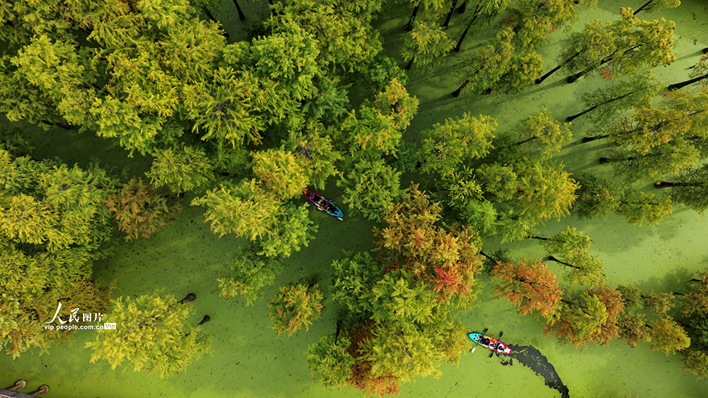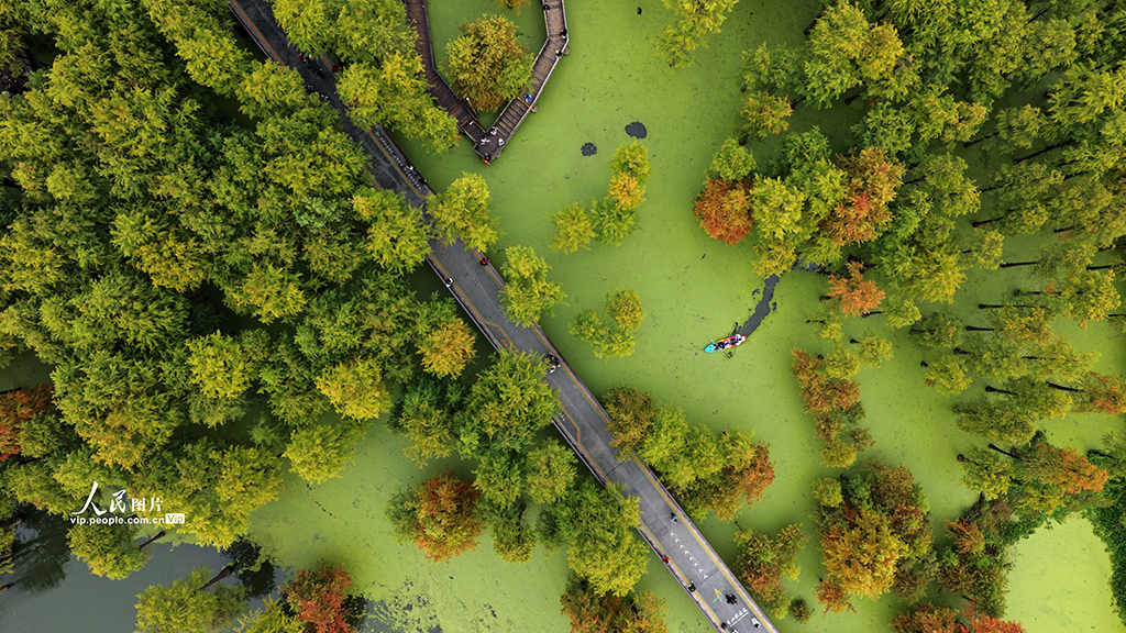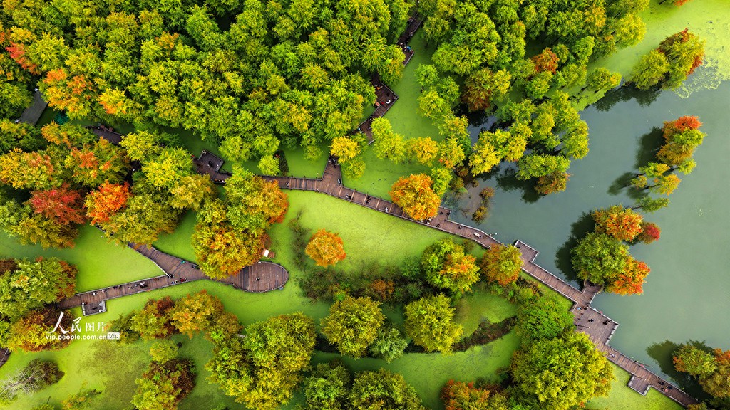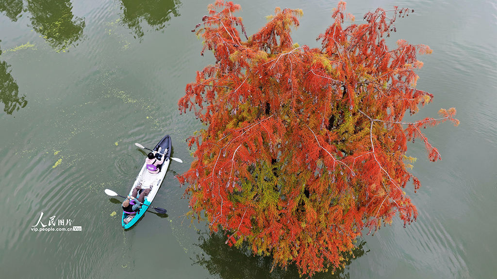 2025年11月11日,游客在浙江省杭州市临安区青山湖景区游览,欣赏秋日美景。汪建林摄
